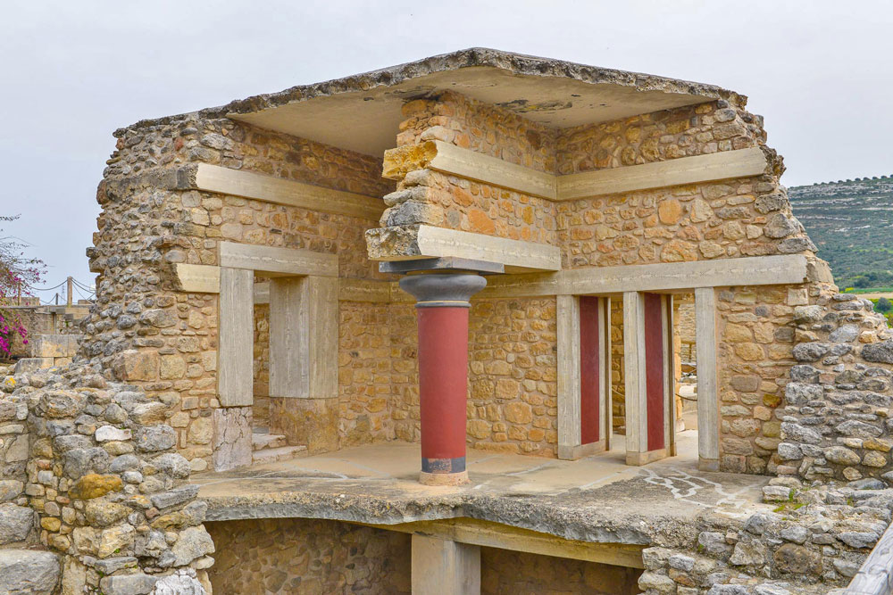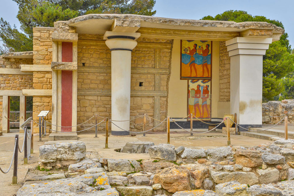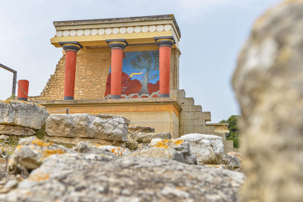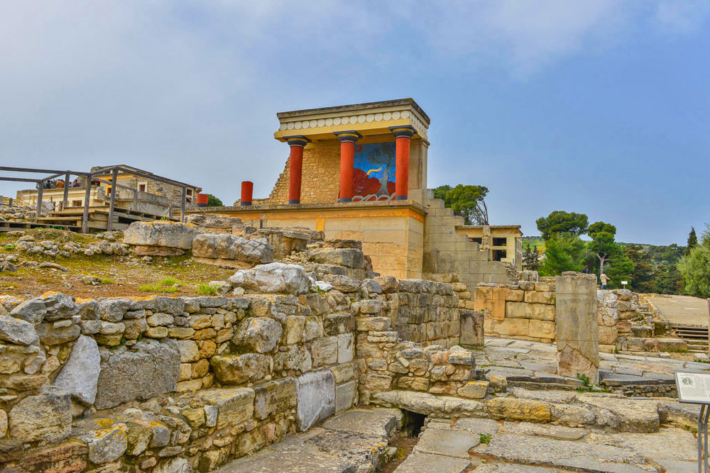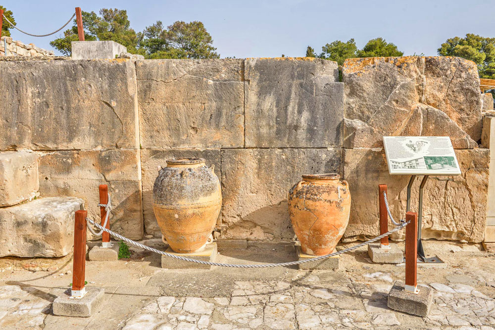 The Minoan Palace of Knossos is located 5km southeast of Heraklion in an area inhabited continuously since the Neolithic Age, 9000 years ago. During the Bronze Age, Knossos became the capital of the Minoan Civilization and the base of King Minos himself. According to mythology, Minos kept the famous architect Dedalos prisoner until he would finish the highly elaborate and complex cluster of multi-storied buildings that compose the palace. Dedalos built a set of wings him and his son to escape but Ikarus flied too close to the sun and fell to his death. The mythical creature Minotaur was also supposed to live in Knossos, inside a complex maze designed by dedalos, the famous Labyrinth. Knossos Palace is the absolute symbol of the Minoans and a visit to the site will give you the chance to see a rich strata of ruins, wall paintings and frescos that offer a vivid image of the grandeur and cultural richness of the Minoan Civilization.